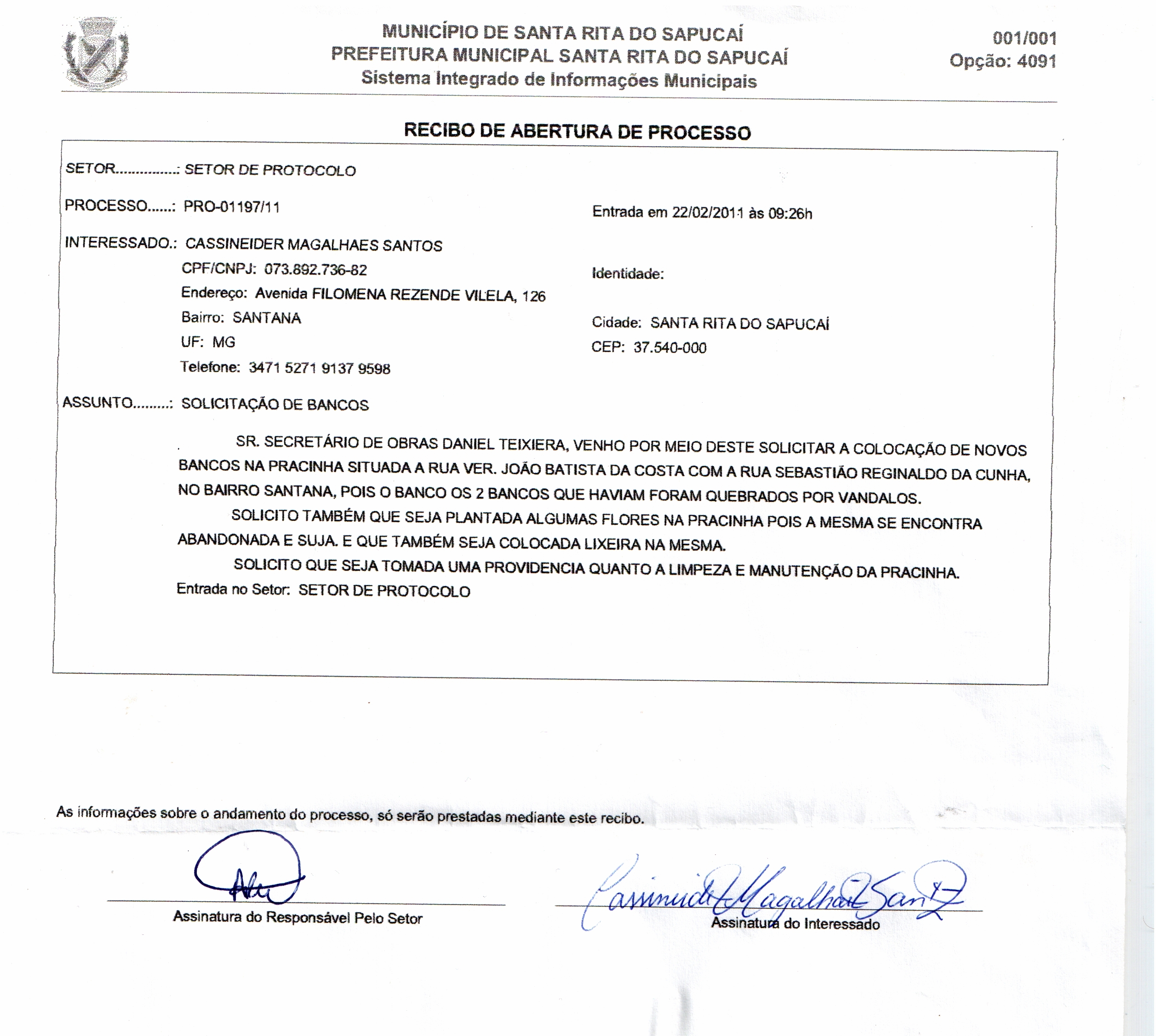 Venho por meio desta, pedir esclarecimento da solicitação de preservação da “Pracinha do Eli” na qual esta situada na Rua João Batista da Costa, Bairro Santana. Na qual a mesma foi aceita pelo SR. Daniel Teixeira, que esteve no local e afirmou que em alguns dias a melhoria seria feita.Mas até o prezado momento não foi realizado nenhuma melhoria. (Requerimento feito em 22/02/11).