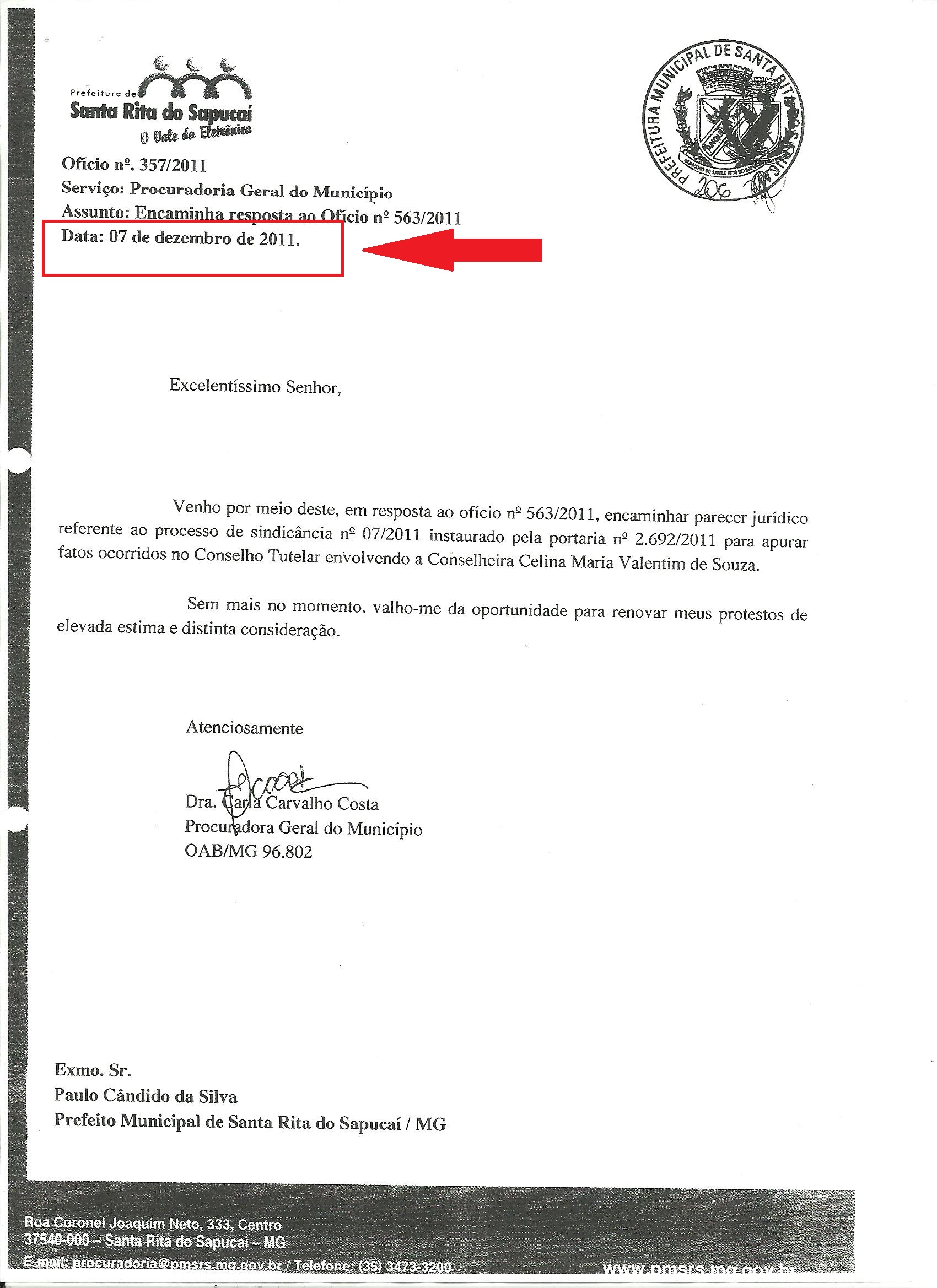 E a Procuradoria Municipal encaminhou seu parecer ao Sr Prefeito no dia 07 de Dezembro de 2011, conforme documento abaixo:
