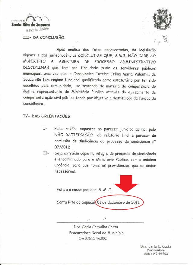 A Procuradoria Municipal encerrou seu parecer no dia 01 de Dezembro de 2011, conforma documento abaixo: