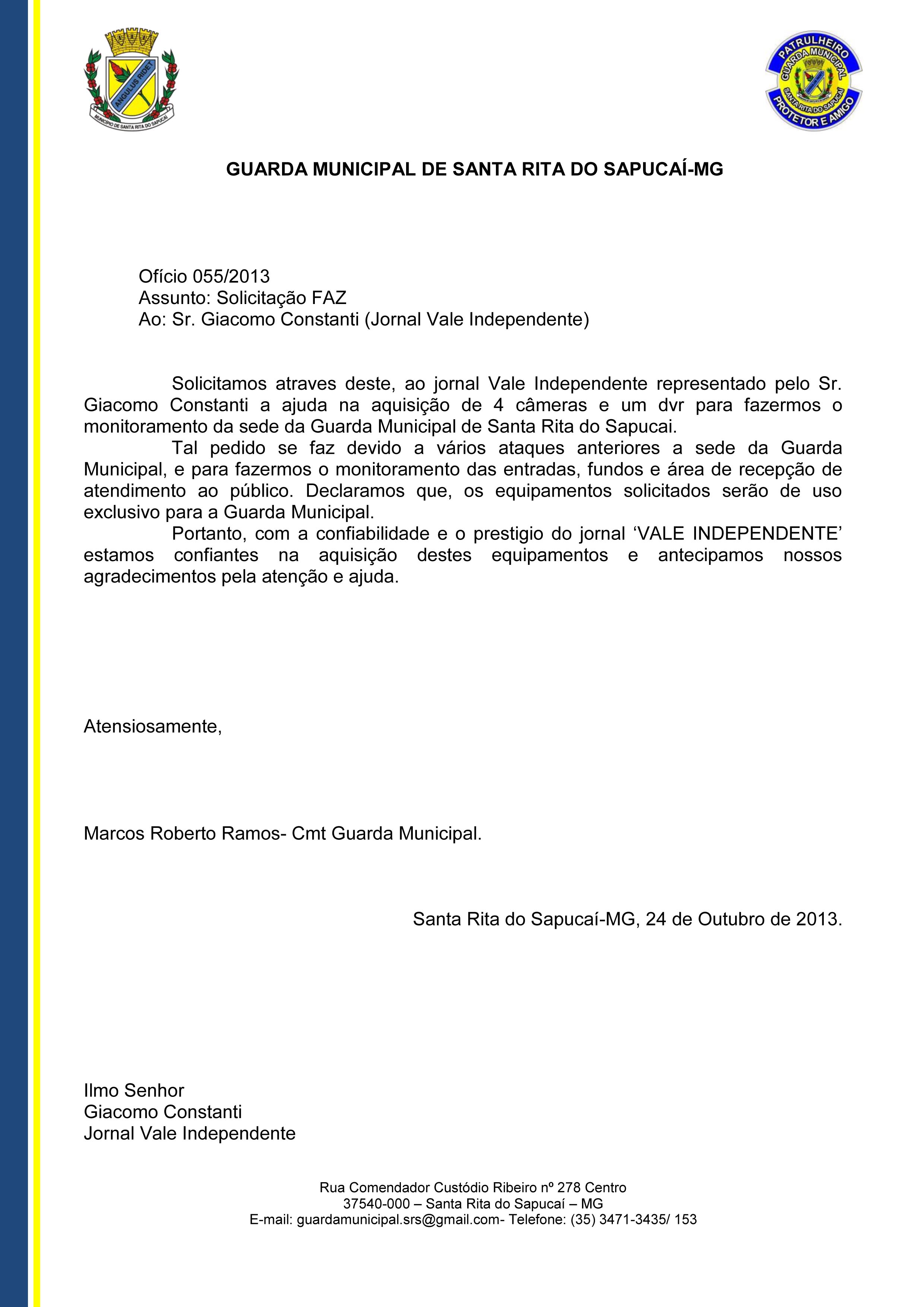 Essa doação foi em atendimento ao ofício 055/13 da Guarda Municipal de Santa Rita do Sapucaí: