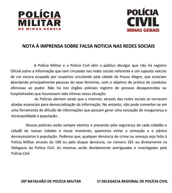 A Polícia Militar e a Polícia Civil vêm a público divulgar que não há registro Oficial sobre a informação que tem circulado nas redes sociais referente a um suposto veículo de cor escura ocupado por suspeitos circulando pela cidade de Pouso Alegre. veja a nota na integra abaixo: