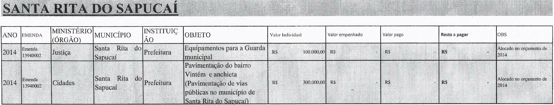 Para Santa Rita do Sapucaí há duas emendas empenhadas, sendo uma delas já disponível de R$ 100.000,00 através do Ministério da Justiça, para compras de veículo e equipamentos para a Guarda Municipal e uma outra através do Ministério das Cidades de R$ 300.000,00 para pavimentação de parte da estrada do Vintém ao lado do Bairro Anchieta, dependendo apenas da conclusão do projeto por parte da Prefeitura Municipal e a abertura da conta para o recebimento da verba.
