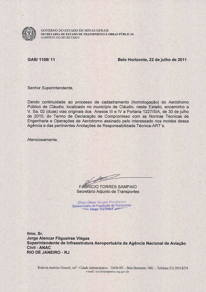 O governo estadual agiu com rigor e seguiu todos os trâmites legais para garantir a melhor solução para o Estado. Prova disso é que os interesses de um parente do governador na época foram contrariados para que prevalecesse o interesse público.aecioO aeroporto do município de Cláudio (MG) é de uso público e, assim como outros, aguarda a conclusão do processo de homologação junto à Agência Nacional de Aviação Civil (Anac), cujo início se deu em 22 de julho de 2011.