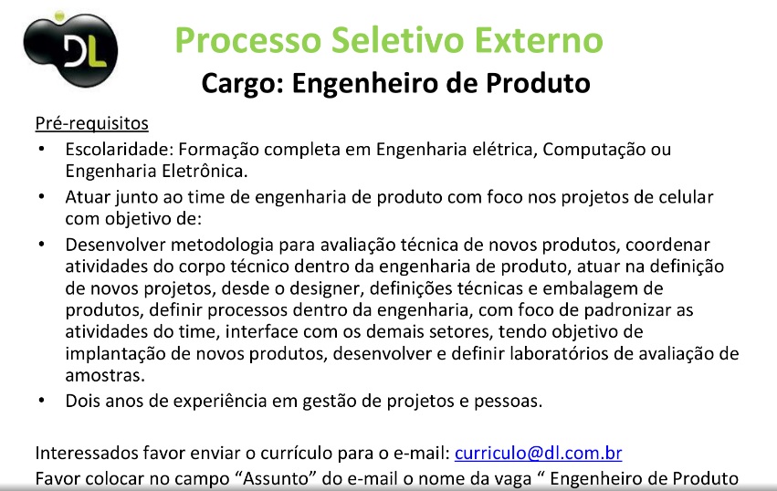Oportunidade de Emprego – Engenheiro de Produto