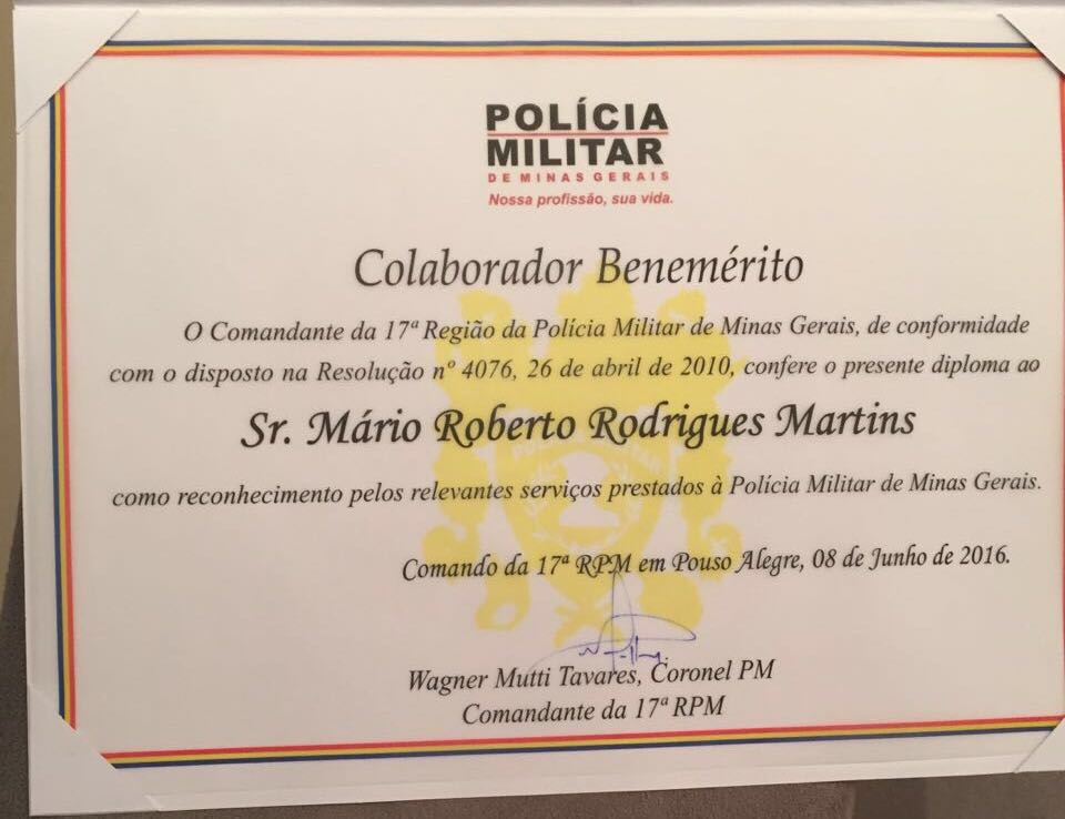 Os nossos parabéns ao Dr. Mário pelos relevantes serviços prestados à nossa Comarca e à Polícia Militar de Minas Gerais.