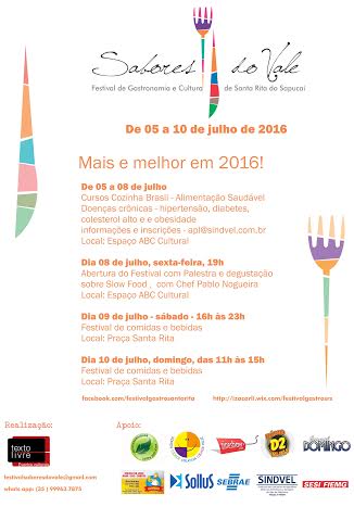 O Sabores do Vale – II Festival de Gastronomia e Cultura de Santa Rita do Sapucaí, que será realizado no período de 05 a 10 de julho, traz para Santa Rita do Sapucaí, com apoio do SINDVEL e Sistema FIEMG os cursos de alimentação saudável do Cozinha Brasil, este ano com foco em doenças crônicas como hipertensão, diabetes, colesterol alto e obesidade.