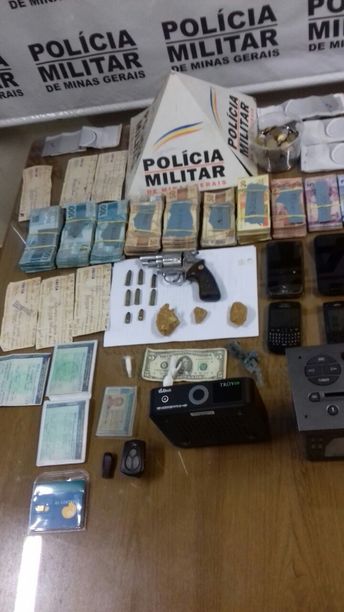 No total, foram apreendidos: 1 revolver cal.38 marca Taurus, 78g de crack, 2 invólucros de cocaína, 2 buchas de maconha, R$ 52.465,55, 2 veículos, diversas folhas de cheque, 5 cadernos contendo anotações diversas e 5 aparelhos celulares. Os presos e todo o material apreendido foram levados à Delegacia de Polícia para demais providências.