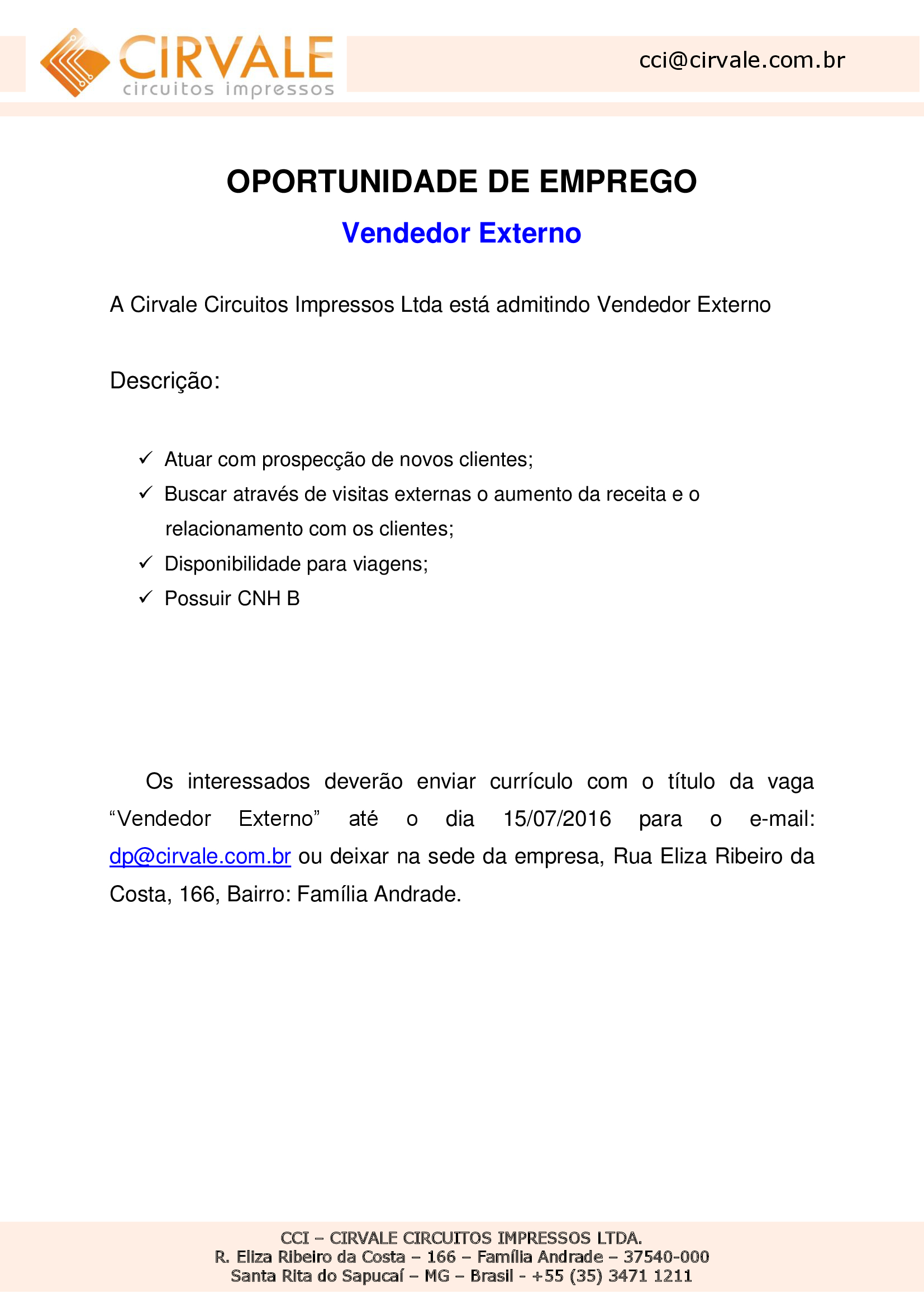Oportunidade de Emprego – Vendedor Externo