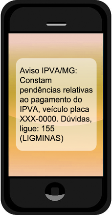 Por uma questão de segurança do usuário, a mensagem não contém link e é muito clara: “Aviso IPVA/MG: Constam pendências relativas ao pagamento do IPVA (ano de exercício), veículo placa (xxx-xxxx). Dúvidas, ligue: 155 (LIGMINAS)”.