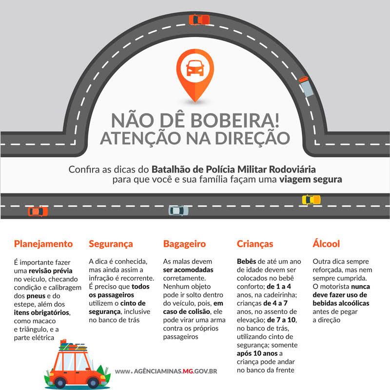 Com o feriado municipal na próxima segunda-feira(15), a movimentação nas estradas, especialmente nas saídas de Belo Horizonte, tende a aumentar. Por essa razão, o Batalhão de Polícia Militar Rodoviária (BPMRv) alerta sobre alguns cuidados que os motoristas devem adotar ao deixar a capital e região metropolitana neste período.