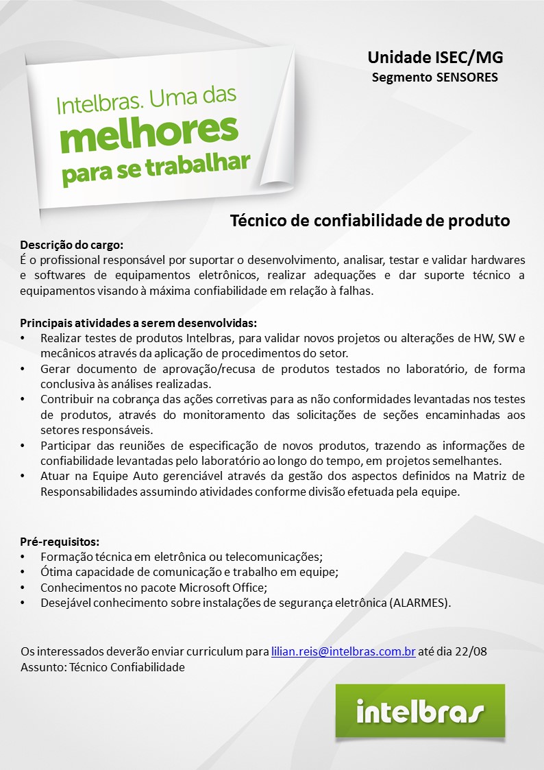 Oportunidade de Emprego – Técnico de Confiabilidade de Produto