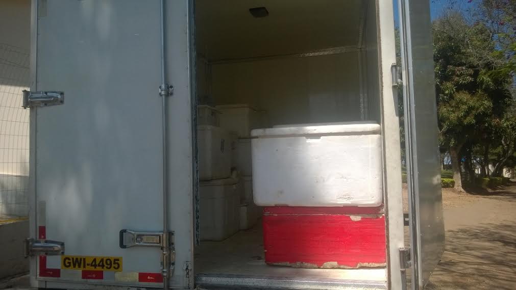Foi Solicitado que fosse aberto o baú do caminhão, sendo constatado que não havia câmera fria e que os peixes estavam sendo transportados em caixas de isopor com temperatura próxima da natural e com certo mau cheiro.