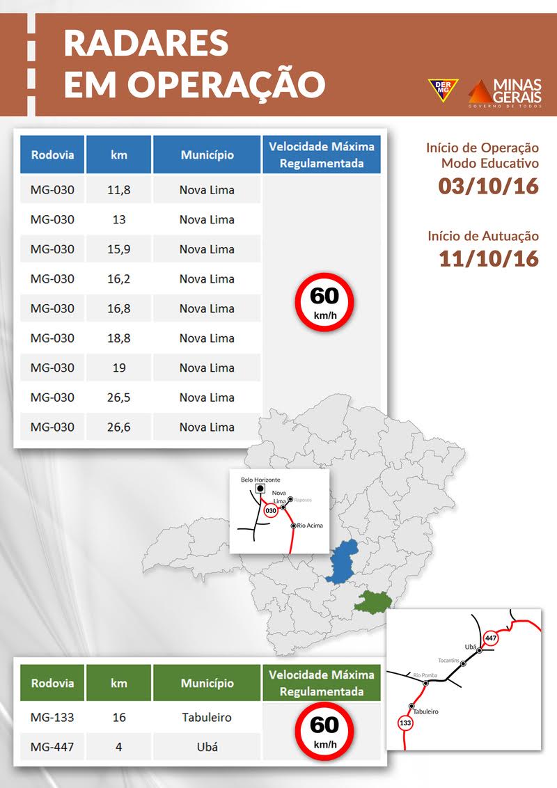Os primeiros equipamentos já estão funcionando em módulo educativo desde o dia 3 de outubro com o limite de velocidade permitido nas vias estaduais, que é de 60 km/h. A MG-030, em Nova Lima, MG-133, em Tabuleiro e MG-447, em Ubá foram as primeiras a receber os novos radares.