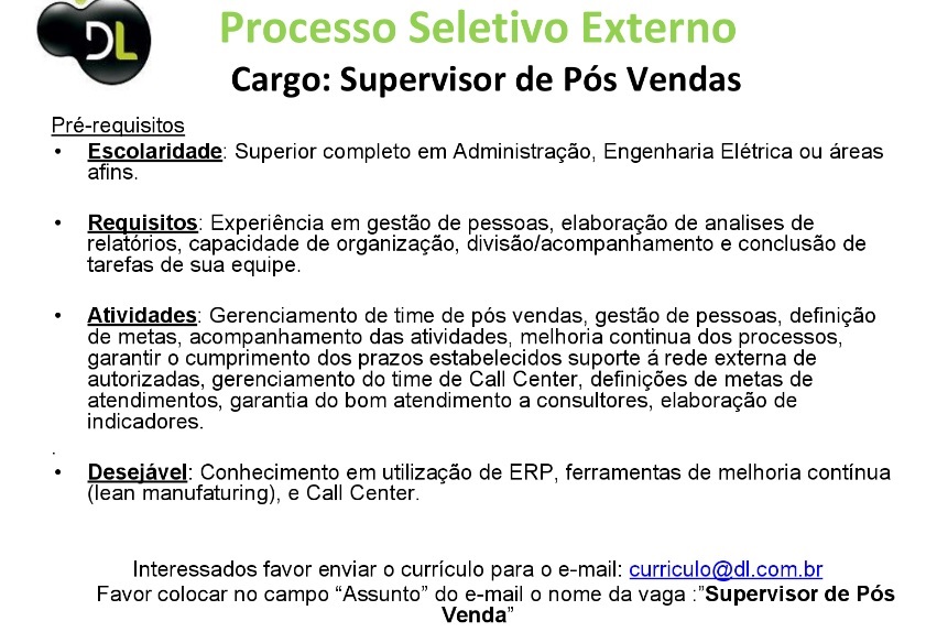 Oportunidade de Emprego – Supervisor de Pós Vendas