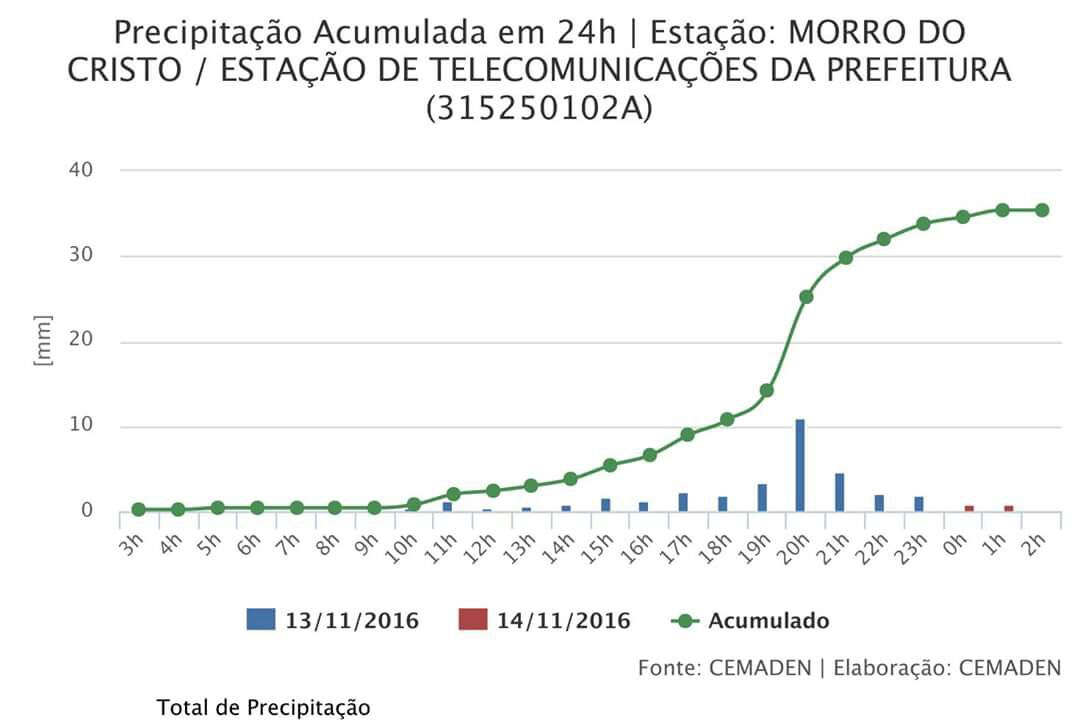 Chove ininterruptamente em Pouso Alegre há pelo menos 24 horas. A imagem abaixo mostra os índices registrados pela Estação Pluviométrica do CEMADEN instalado no alto da Serra do Cristo. À zero hora de ontem(14), o volume de chuva chegava a 34,6 mm (últimas 24 horas). No acumulado do mês de novembro o volume era de 99,2 mm, o que tecnicamente representa mais chuva do que a média normal para todo o mês de novembro.