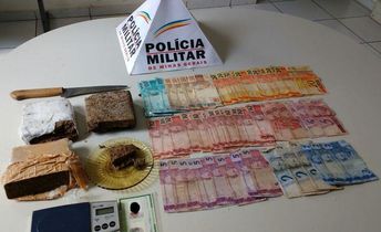 A Polícia Militar realizou busca pessoal sendo localizada a quantia de R$1.289,00 em dinheiro, e após cientificá-lo das denuncias, os militares adentraram no imóvel onde localizou 03 tabletes prensados de maconha, 01 balança de precisão, 01 prato contendo em seu interior 01 tablete prensado e uma faca com resquícios de maconha, tendo ainda o autor afirmou aos militares que o dinheiro era proveniente da comercialização de entorpecentes