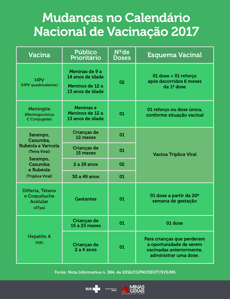 O ano começa com importantes alterações no Calendário Nacional de Vacinação, que têm como objetivo otimizar a cobertura vacinal no país. A ampliação de grupos e faixas etárias fazem parte do Programa Nacional de Imunizações (PNI), conduzido pelo Ministério da Saúde, para 2017.