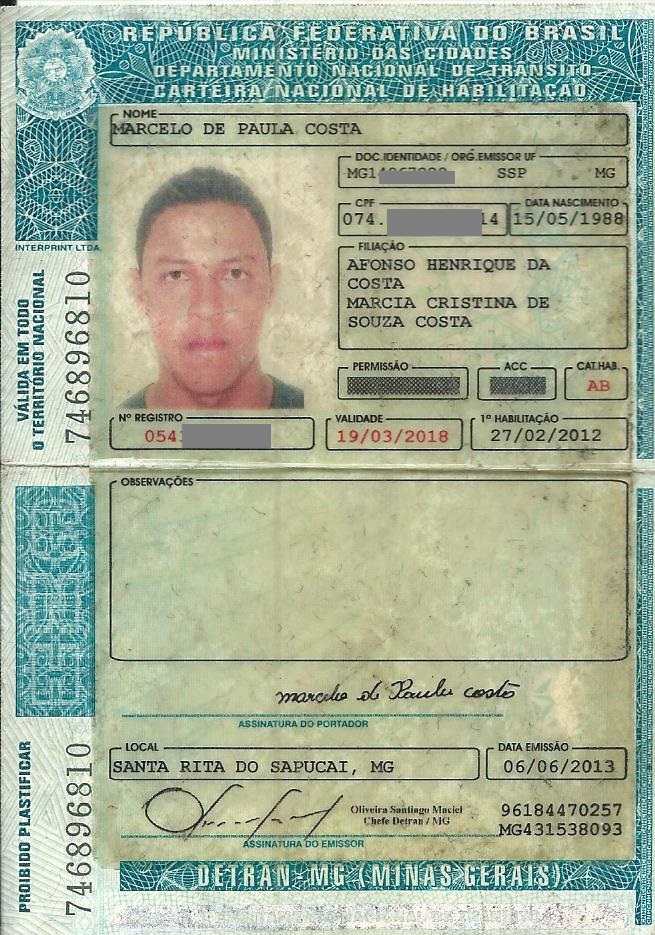 Foi encontrada a Carteira Nacional de Habilitação de MARCELO DE PAULA COSTA.