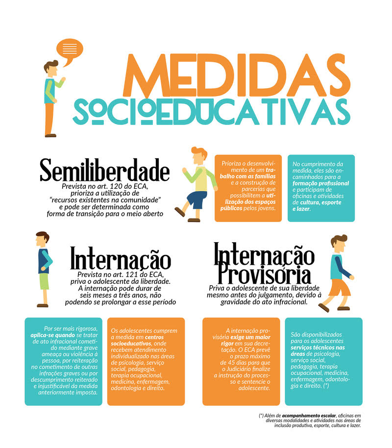 O trabalho com o adolescente ocorre por meio do cumprimento de medidas socioeducativas (veja quadro abaixo) e objetiva proporcionar atendimento integral ao jovem, dando a ele a oportunidade de vivenciar diversas experiências profissionalizantes, escolares, culturais, esportivas e artísticas.