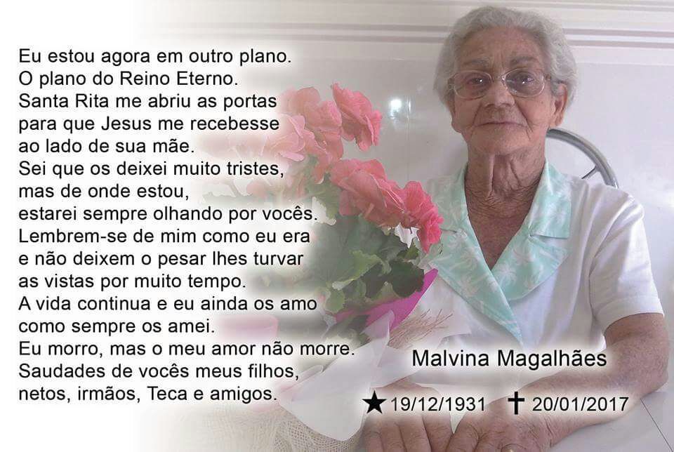 A família enlutada de MALVINA MAGALHÃES agradece a todos pelo apoio e carinho na ocasião de seu falecimento e convida para MISSA DE SÉTIMO DIA pelo eterno descanso de sua alma.