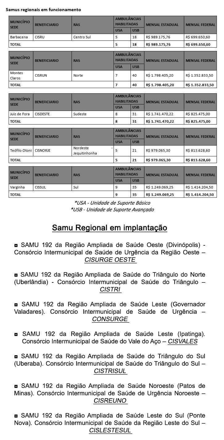 De fevereiro de 2015 a dezembro de 2016, a SES-MG destinou, mensalmente, ao Consórcio Intermunicipal de Saúde da Macro Região do Sul de Minas, que gerencia o serviço de atendimento móvel de urgência e emergência Samu/192 na região, R$ 2.663.273,75 milhões para custeio, ficando responsável pela parte do Ministério da Saúde, já que o Samu ainda não era credenciando pelo ministério.