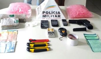 Em Pouso Alegre, a Policia Militar em cumprimento de mandado de busca e apreensão, compareceu na Rua Maria José Soares Domingos, bairro Faisqueira, onde durante as buscas foram localizados 02 tabletes de maconha no fundo do quintal em uma cova rasa, 01 réplica de arma de fogo encontrada em uma gaveta de armário, além de materiais utilizados para a preparação e embalagem de drogas, 03 aparelhos celulares e a quantia de R$193,00 em dinheiro.
