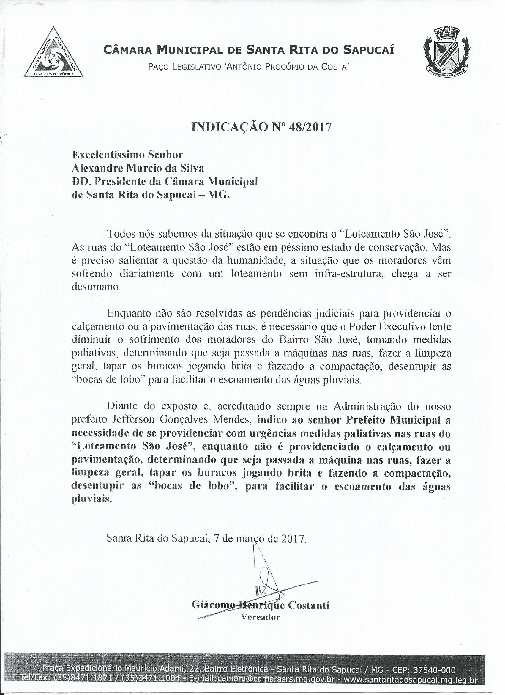 Na reunião ordinária da Câmara Municipal de Santa Rita do Sapucaí, o Vereador Giácomo Costanti apresentou uma indicação para que a administração pública providencie com urgência medidas paliativas nas ruas do Loteamento São José, assim como limpeza de modo geral e desentupimento das bocas de lobo.