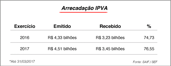 A arrecadação do Imposto sobre Propriedade de Veículos Automotores (IPVA) de 2017 atingiu, no dia 31 de março, R$ 3,45 bilhões. O valor é 7% superior ao arrecadado no mesmo período de 2016 e representa 76,5% do total esperado para este ano, que é R$ 4,51 bilhões.