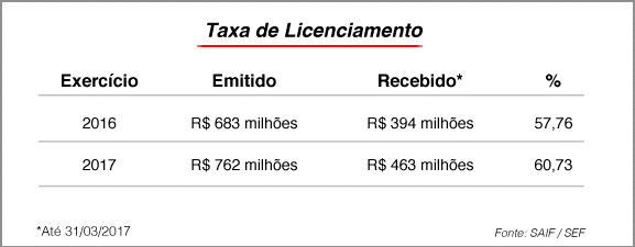 A Taxa de Renovação do Licenciamento Anual de Veículos (TRLAV), no valor de R$ 92,66, venceu no dia 31 de março. Do montante emitido, foram recebidos 60,73%, representando R$ 463 milhões. As penalidades para quem não pagou a taxa no prazo são multa de 0,15% ao dia (até o 30º dia), 9% do 31º ao 60º dia, e de 12% a partir do 61º dia, além de juros (taxa Selic).
