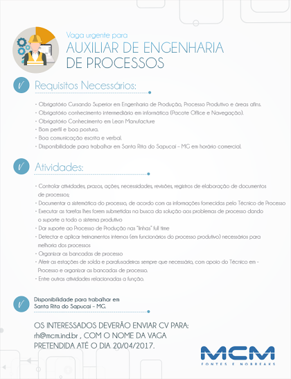 Oportunidade de Emprego – Auxiliar de Engenharia de Processos