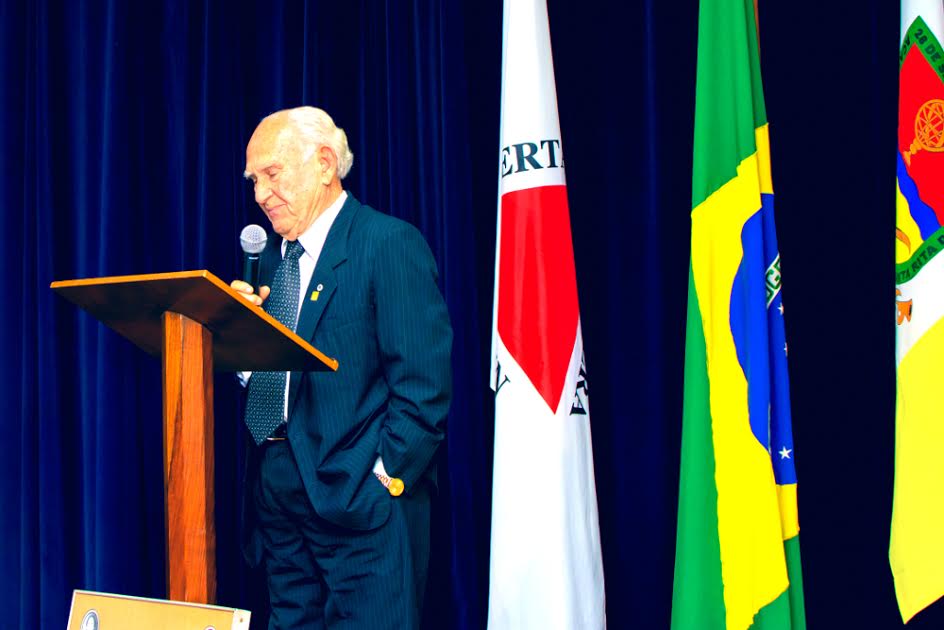 O acadêmico Décio de Almeida Azevedo, irmão de Edméa Carvalho, se emociona em seu discurso durante sessão solene da Alca realizada no último dia 21 de abril. (Foto: Ériton Queles/Alca).