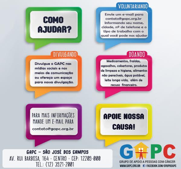 Em caso de diagnóstico positivo para o câncer, venha o conhecer o GAPC – Grupo de Apoio a Pessoas com Câncer, temos como objetivo ajudar a melhorar a saúde e qualidade de vida dos assistidos. Nossa casa na Avenida Rui Barbosa, número 164 – Centro. Telefone: (12) 3921-2001 ou acesse: http://www.gapc.org.br