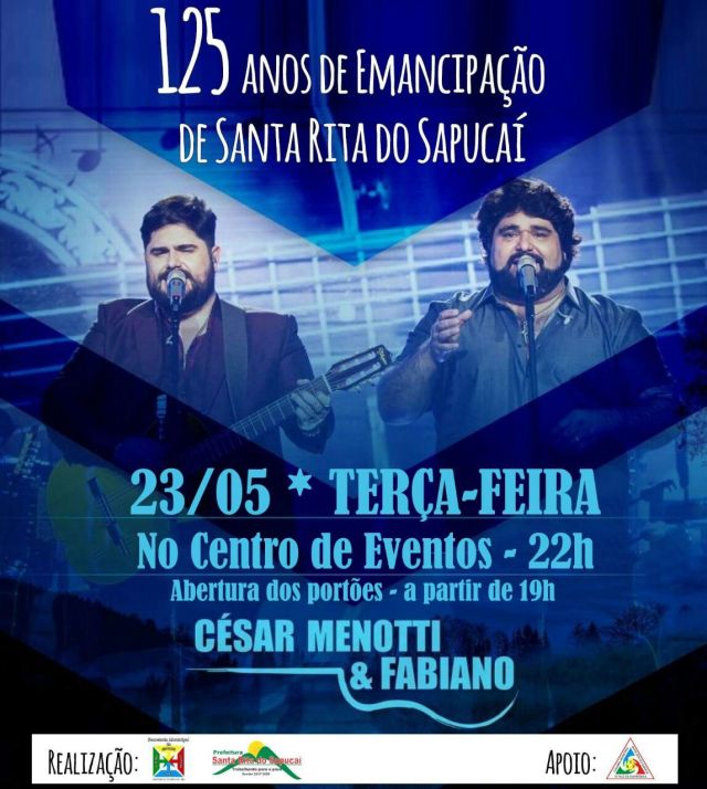 Convidamos a toda população de Santa Rita do Sapucaí e região para comemorar os 125 anos de Emancipação Política de nosso município que terá o show de César Menotti e Fabiano no dia 23/05 no Centro Municipal de Eventos!