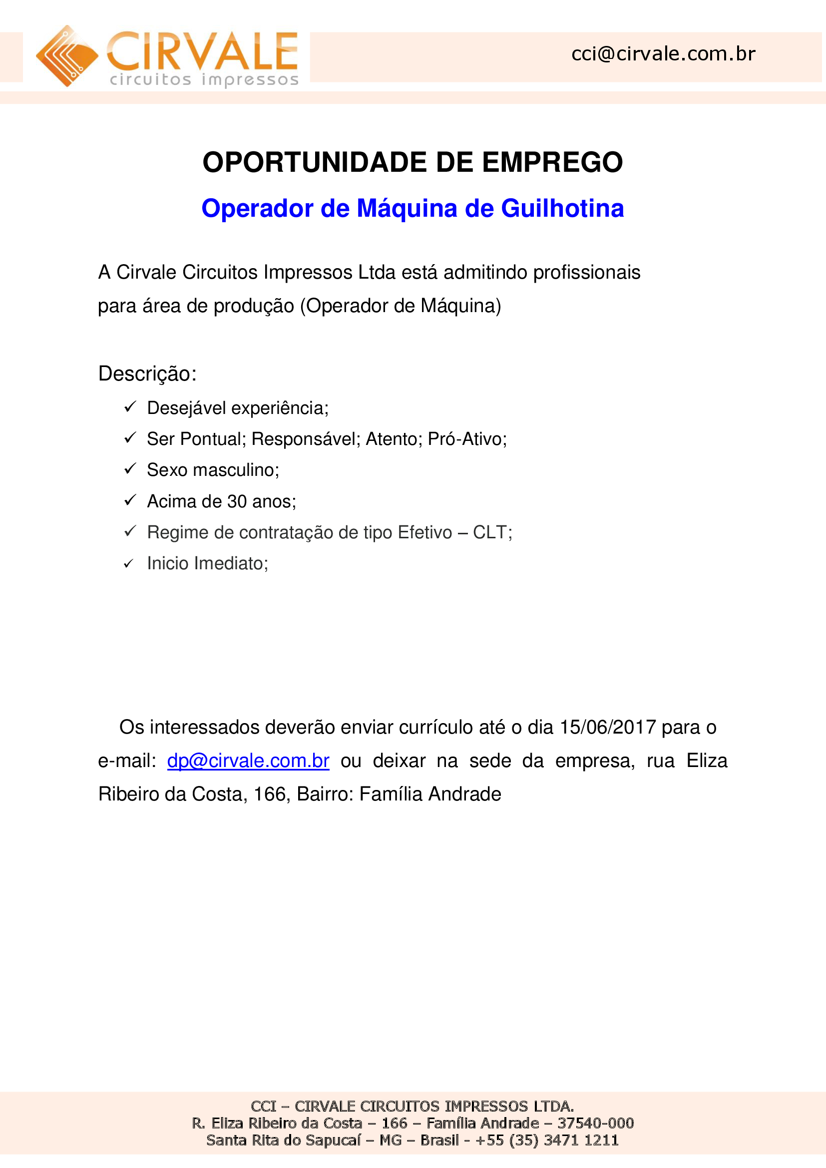 Oportunidade de Emprego – Operador de Máquina de Guilhotina