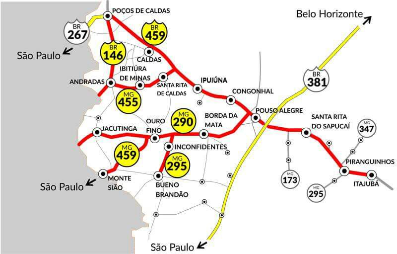 Ao todo serão 7 praças de pedágio na região, 1 na BR 146 no trecho entre Andradas e Poços de Caldas, na altura do Km 544,8, próximo ao Clube da Uva.
