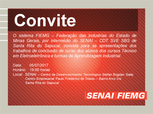 Convite – Feira de apresentação dos projetos de TCC – SENAI Cursos Técnico em Eletroeletrônica e Aprendizagem Industrial