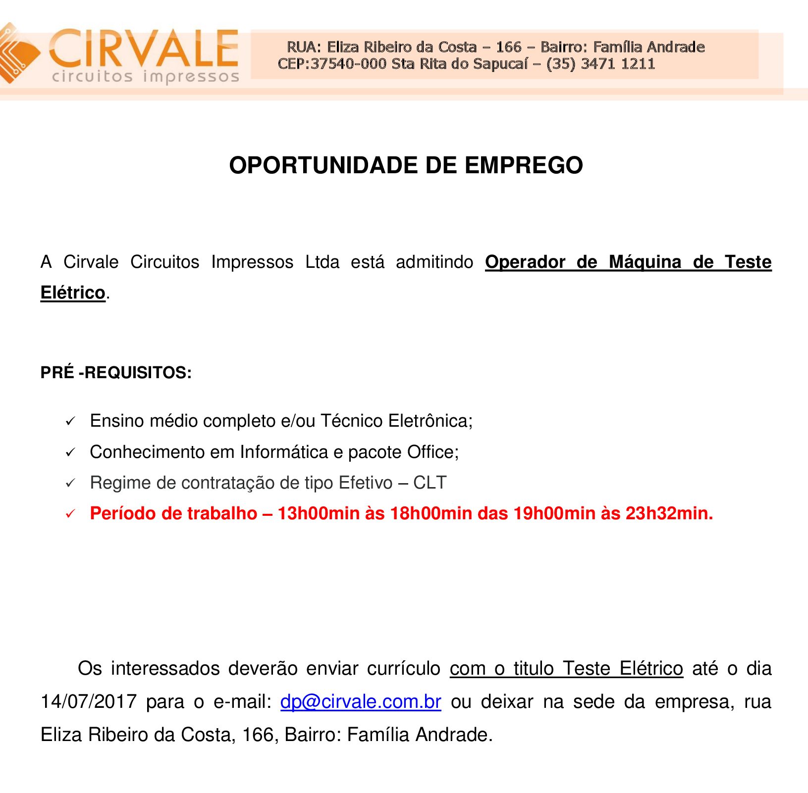 Oportunidade de Emprego – Operador de Máquina de Teste Elétrico