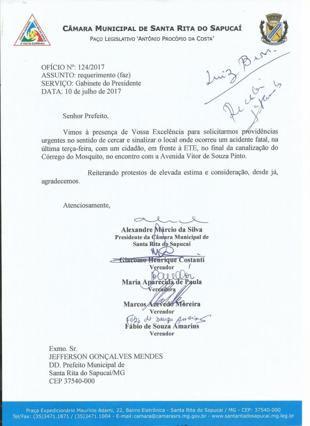 Em Santa Rita do Sapucaí, vereadores pediram à prefeitura municipal através do prefeito Jefferson Gonçalves Mendes, que cerque e sinalize o final do Córrego do Mosquito, onde ocorreu um grave acidente com a queda de um andarilho.