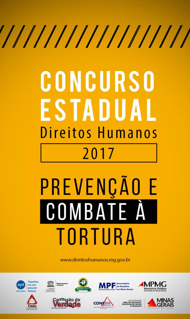 O Concurso Mineiro de Direitos Humanos 2017, é realizado com o apoio do Conselho Estadual de Defesa dos Direitos Humanos (Conedh), da Comissão da Verdade em Minas Gerais (Covemg), do Tribunal de Justiça (TJMG), do Ministério Público (MPMG), do Ministério Público Federal (MPF-MG), da Defensoria Pública (DPMG), da Organização das Nações Unidas para a Educação, a Ciência e Cultura (Unesco) e da Associação de Prevenção à Tortura (APT).