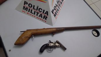 A Guarnição deparou com um saco plástico jogado na beira da estrada pelos suspeitos, e ao ser verificado, foi constatado em seu interior um pistolete artesanal e uma garrucha, dois canos.