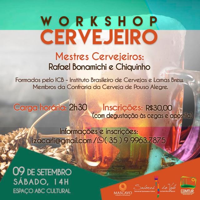 Então participe do Workshop Cervejeiro que faz parte da programação do Sabores do Vale – III Festival de Gastronomia e Cultura de Santa Rita do Sapucaí, que acontece nos dias 08, 09 e 10 de setembro, na Praça Santa Rita.