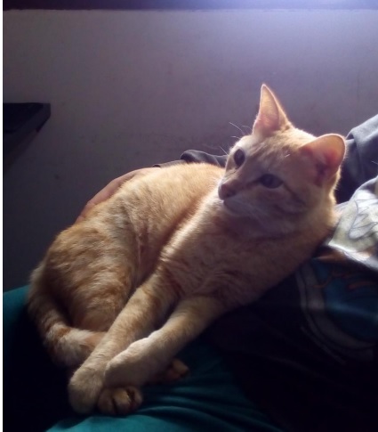 Atende pelo nome de Nico, é rajado amarelo com branco e possui manchinhas pretas nos olhos e nariz. É um gato manso e se assustou quando foi tomar a vacina contra a raiva hoje(27).