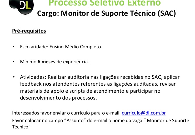 Oportunidade de Emprego – Monitor de Suporte Técnico (SAC)