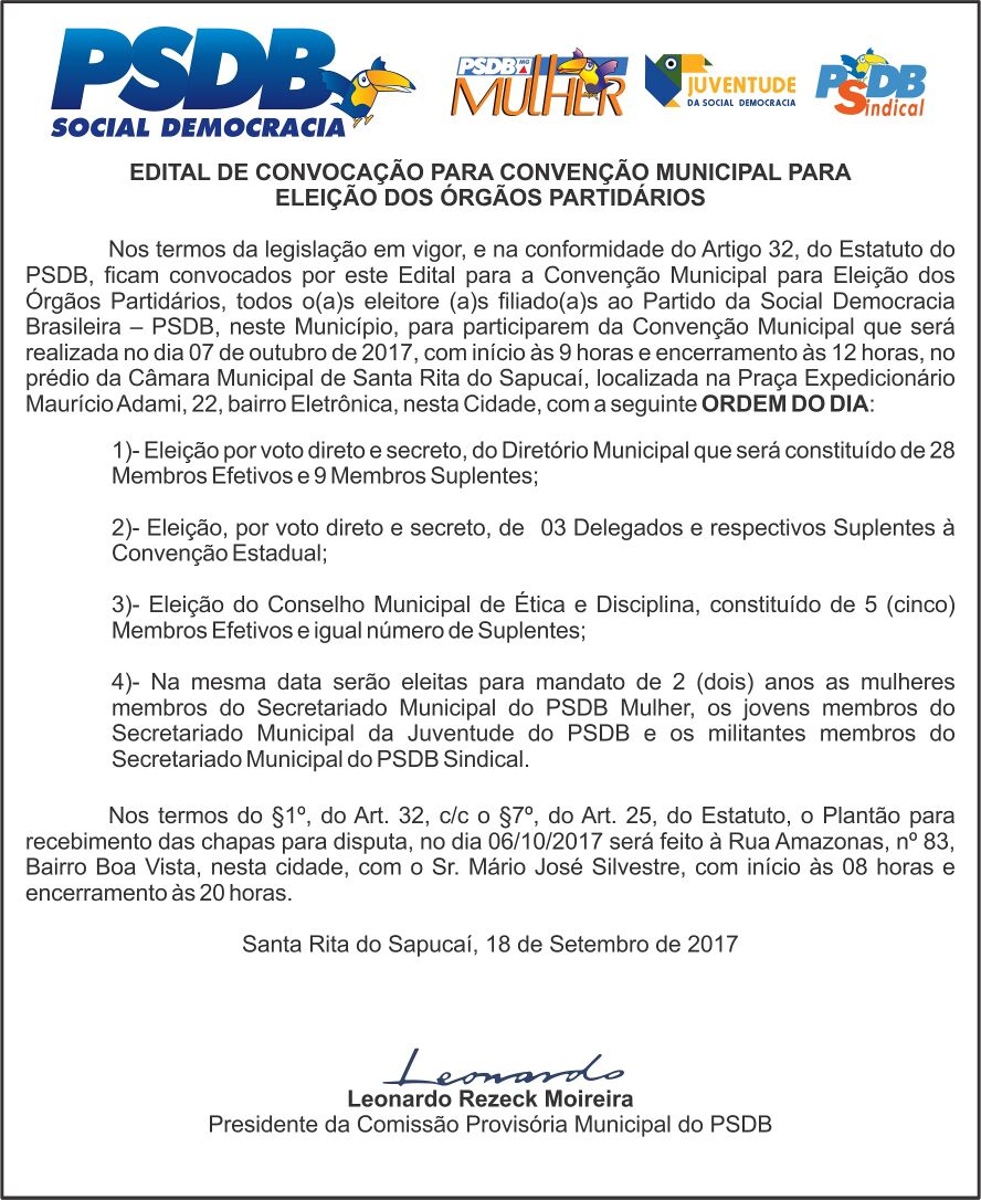 Edital de Convocação para Convenção Municipal para Eleição dos Órgãos Partidários