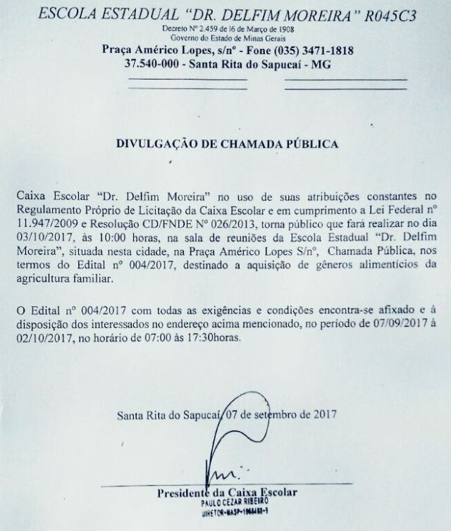 Chamada Pública – Escola Estadual Dr Delfim Moreira