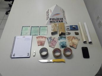 Ao fazerem buscas no endereço, os militares encontraram um tablete grande e dois pequenos de maconha, uma porção de Skank, uma faca com resquícios da droga, um caderno com contabilidade de tráfico e material para embalar as drogas.