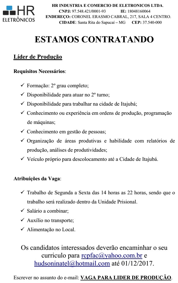 Oportunidade de Emprego – Líder de Produção