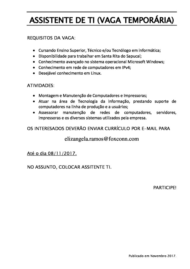 Gostaria do contato da empresa, estou buscando oportunidades em Santa Rita, tenho vasta experiência em TI.