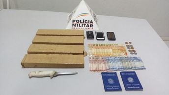 Em Itajubá, a Polícia Militar, durante operação no Bairro Novo Horizonte, apreendeu 04 tabletes de 04 kilos de maconha, R$ 378,00 ( trezentos e setenta e oito reais), 03 celulares e 01 faca.