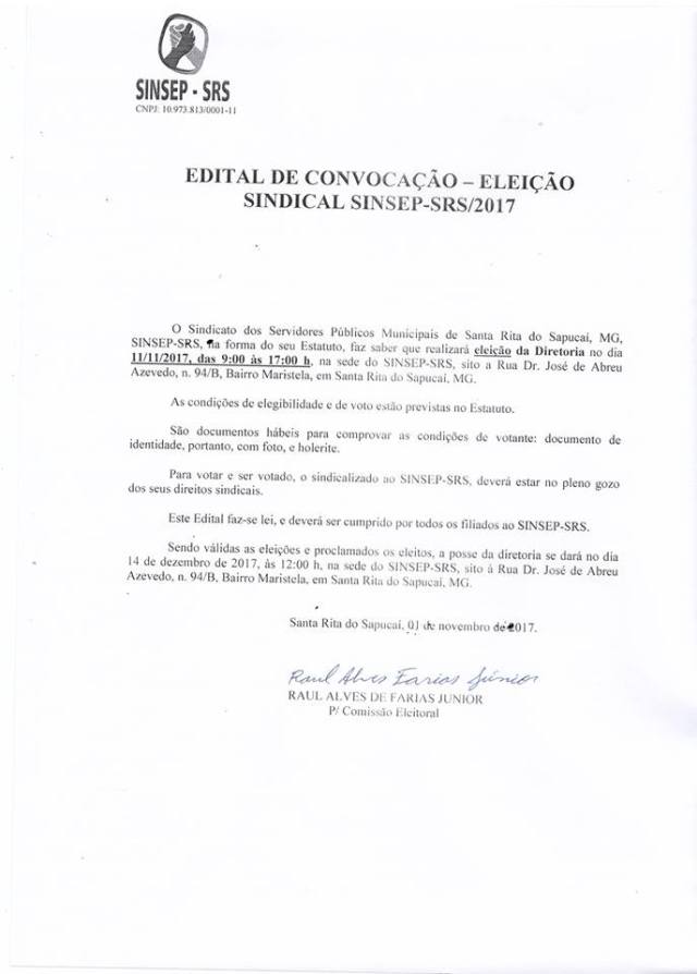Edital de Convocação – Eleição Sindical SINSEP-SRS 2017